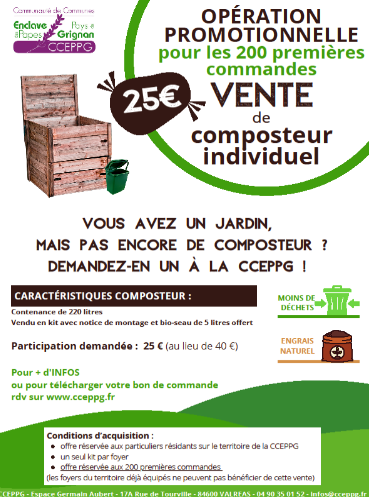 Si vous compostez dans votre jardin, la CCEPPG fait une offre promotionnelle sur les 200 premiers composteurs individuels vendus (25€ au lieu de 40€) à partir du 1er février.