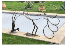 Vends une sculpture d’oiseau en fer forgé destinée à la décoration extérieure, dans l'exemple présent en bordure de piscine. A fixer. L 170cm, largeur 100cm, épaisseur 3cm. En vente pour 500€ (achetée 2000€) pour le compte de Mme Herr et visible chez Anne-Marie et René Brun à Montbrison