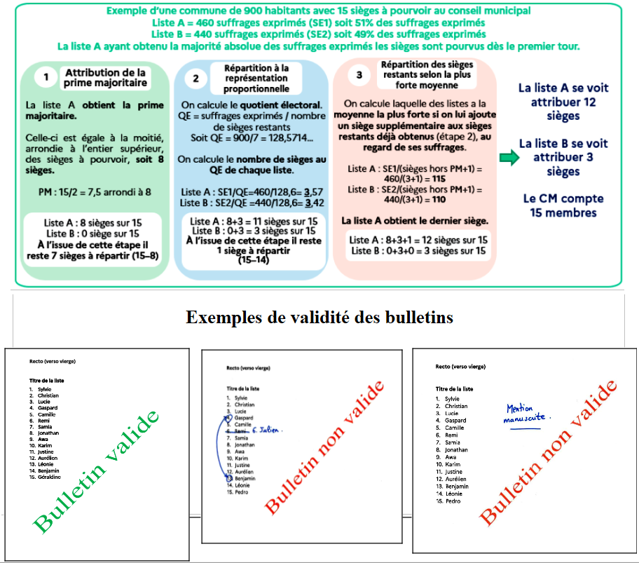 Le mode de scrutin aux élections municipales est un scrutin de liste proportionnel (avec une prime de 50% pour la liste arrivée en tête) à deux tours. Les listes doivent respecter la parité, c'est-à-dire être composées d'autant de femmes que d'hommes, avec une alternance obligatoire une femme, un homme ou inversement. Les électeurs ne peuvent pas rayer des noms ou changer leur ordre sur les bulletins (panachage).
